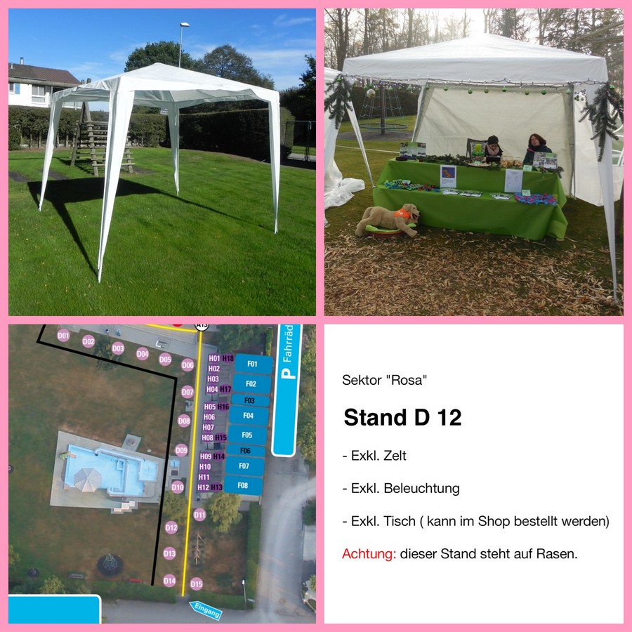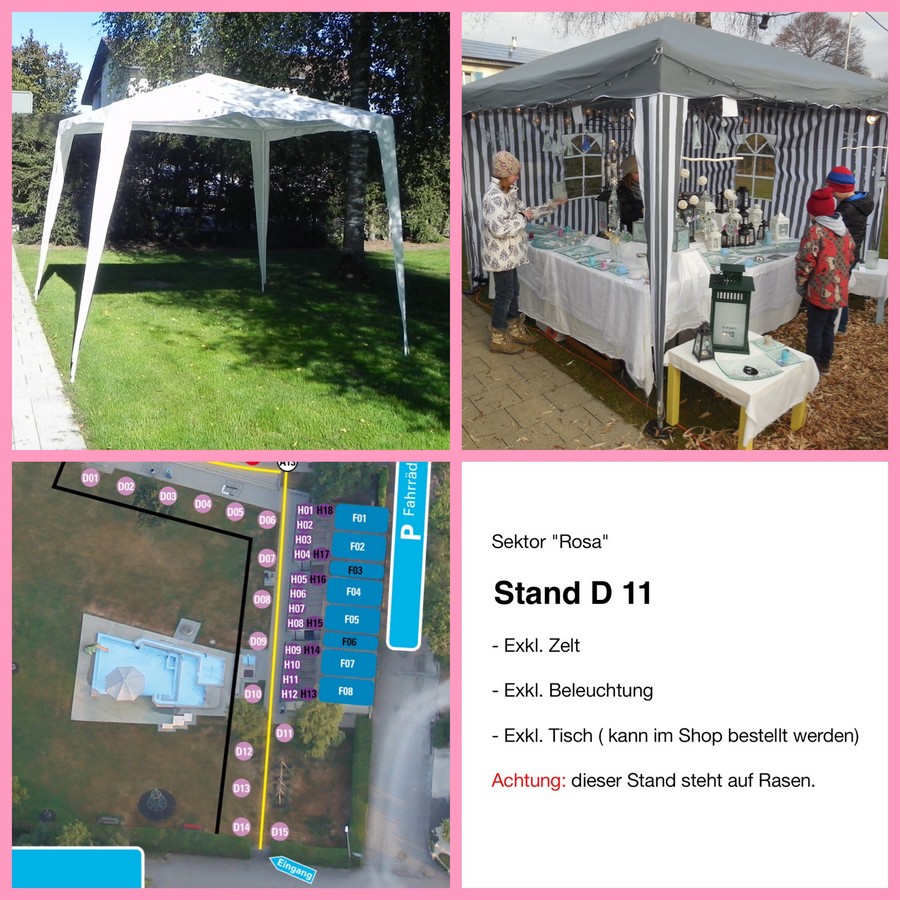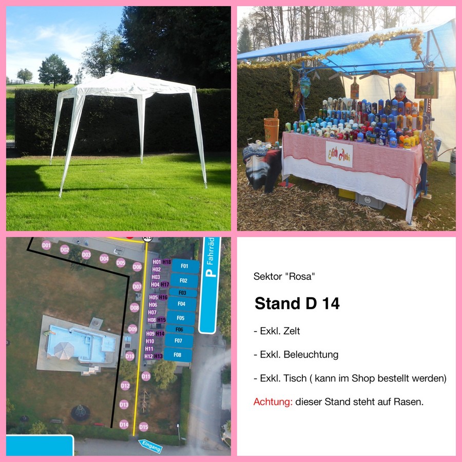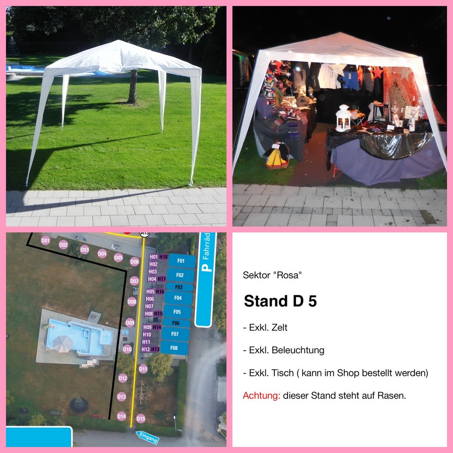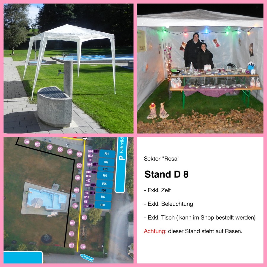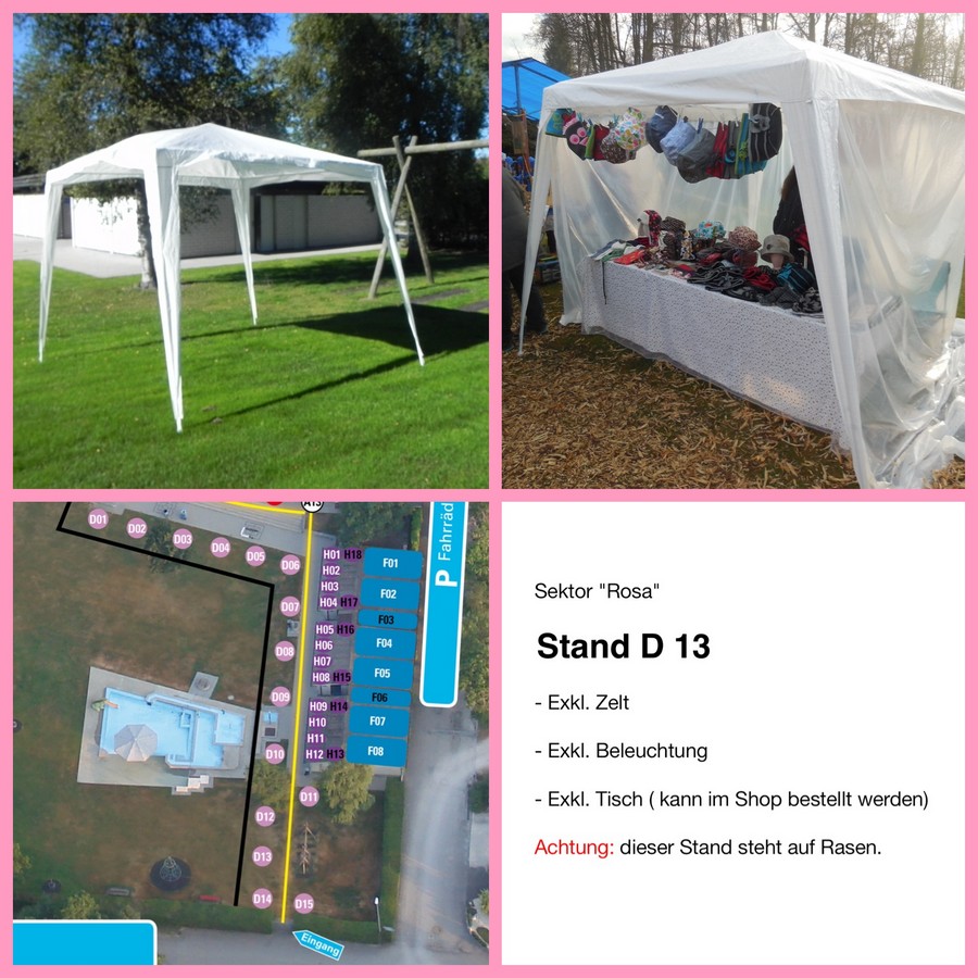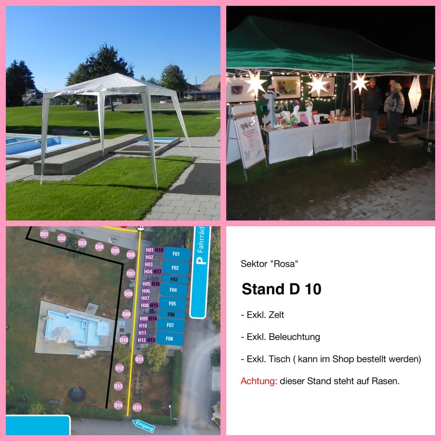 Ein Zelt ist nicht inbegriffen. Dieses muss vom Standbetreiber selbst besorgt, auf- und abgebaut werden. Das Zelt darf die max. Grösse von 4 x 4 Meter nicht überschreiten.