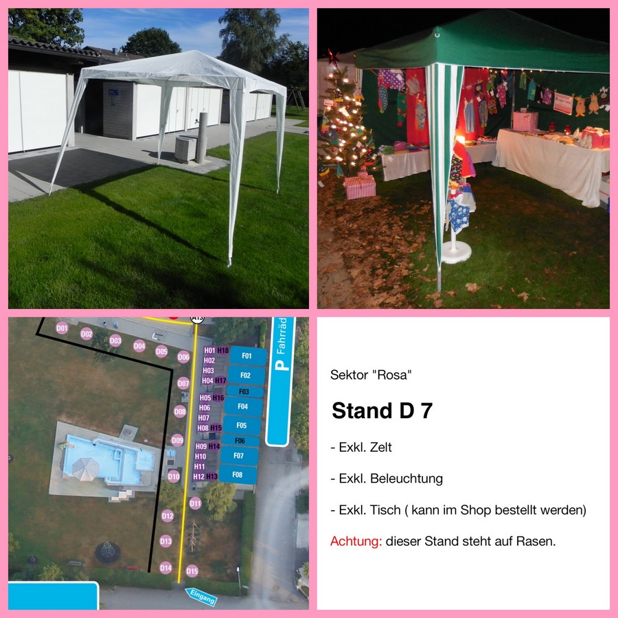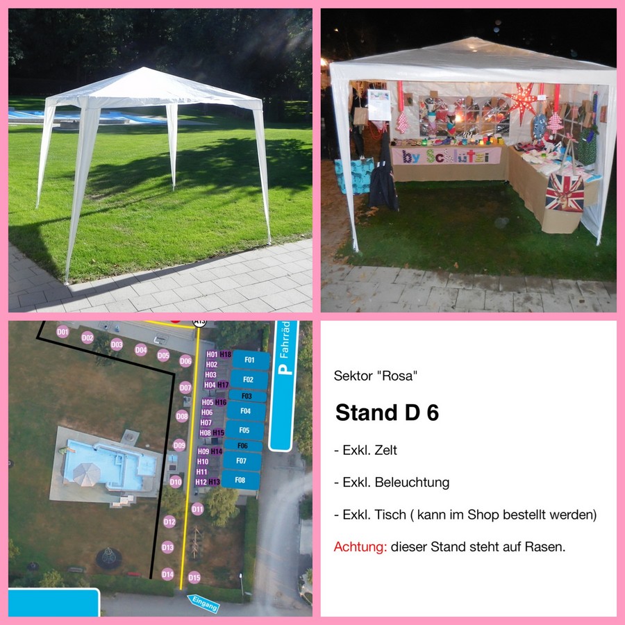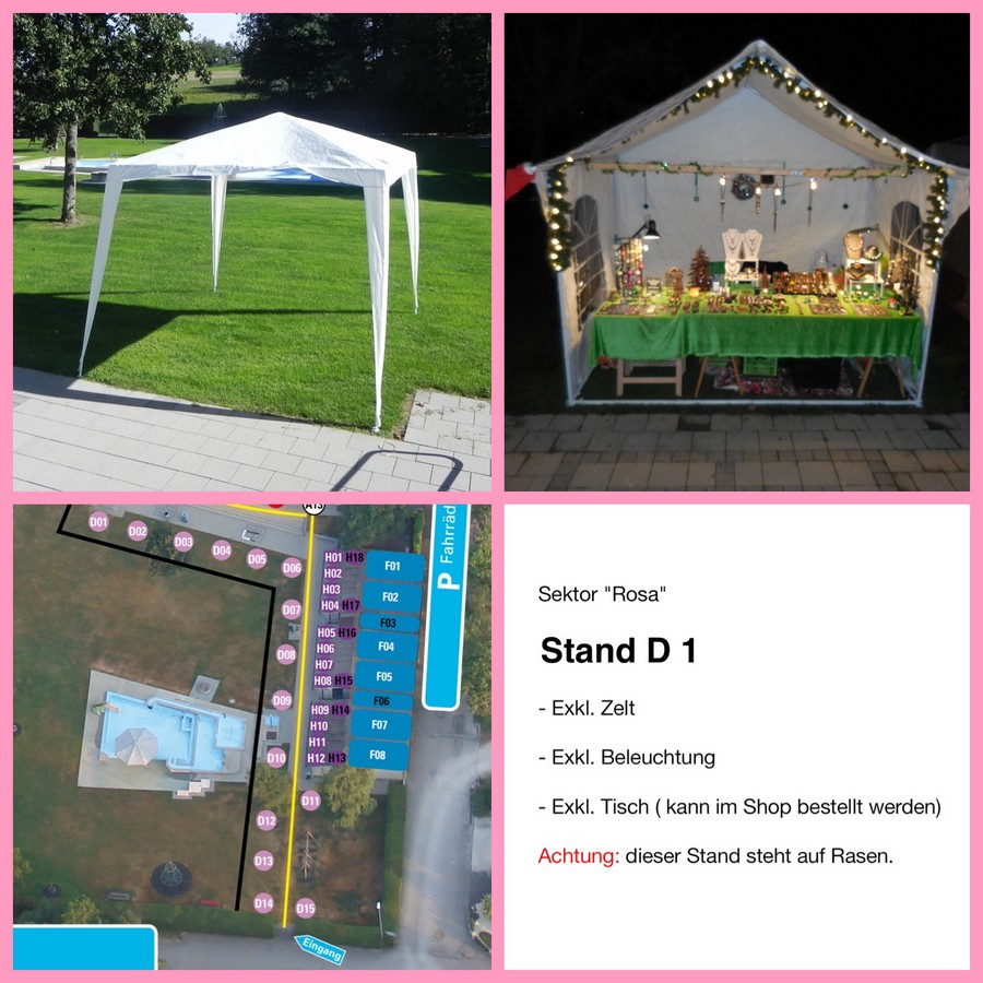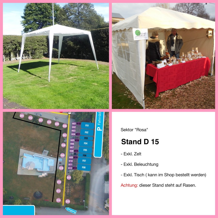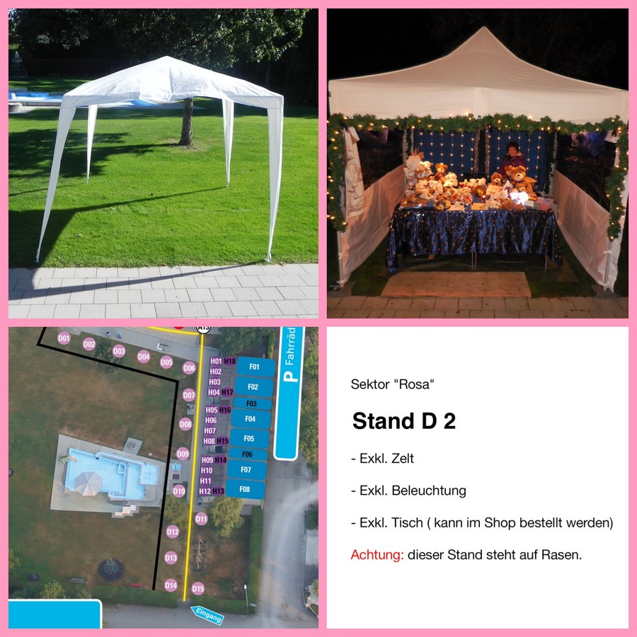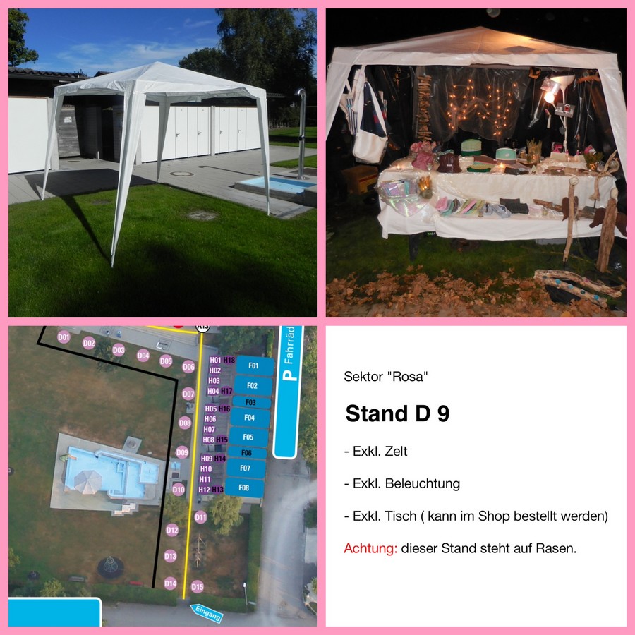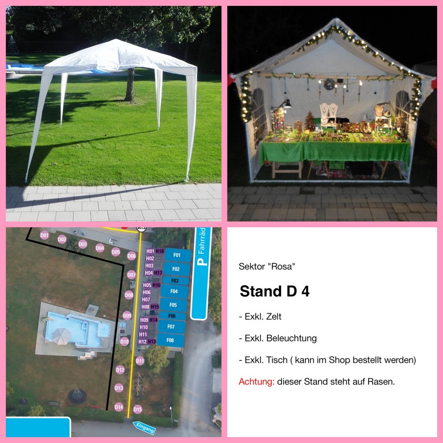 Ein Zelt ist nicht inbegriffen. Dieses muss vom Standbetreiber selbst besorgt, auf- und abgebaut werden. Das Zelt darf die max. Grösse von 4 x 4 Meter nicht überschreiten.