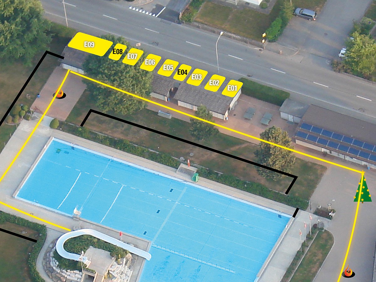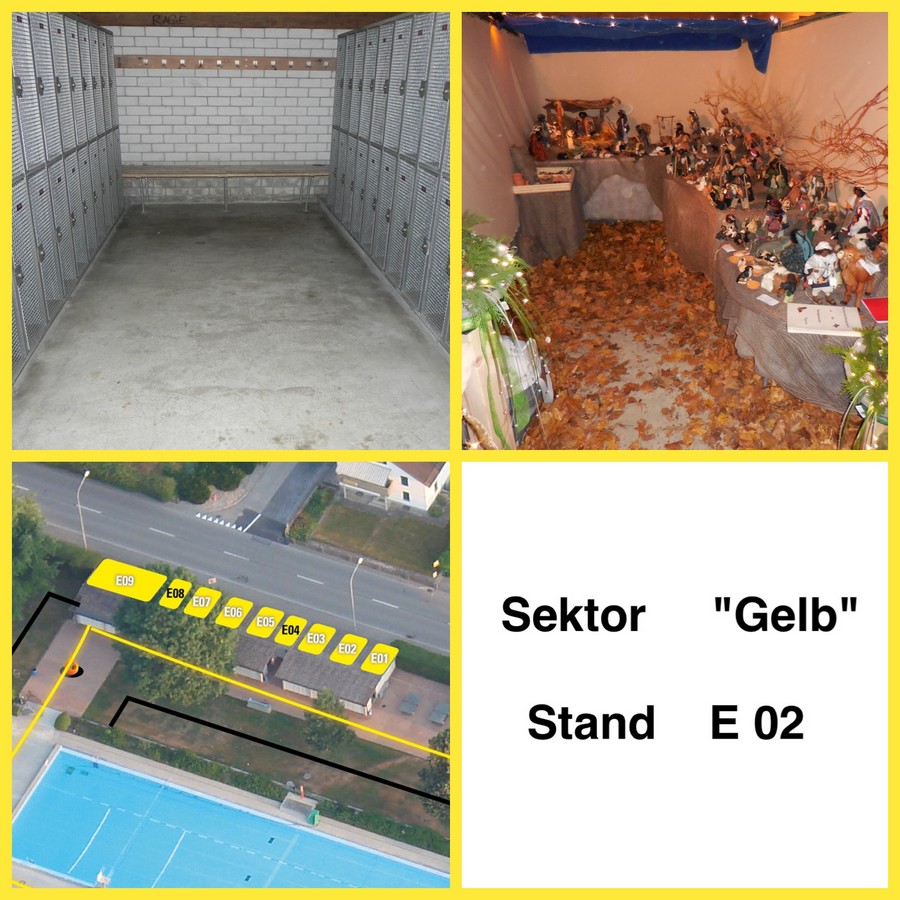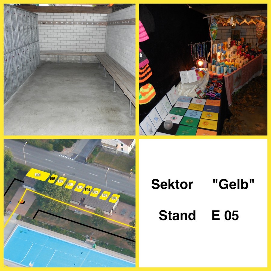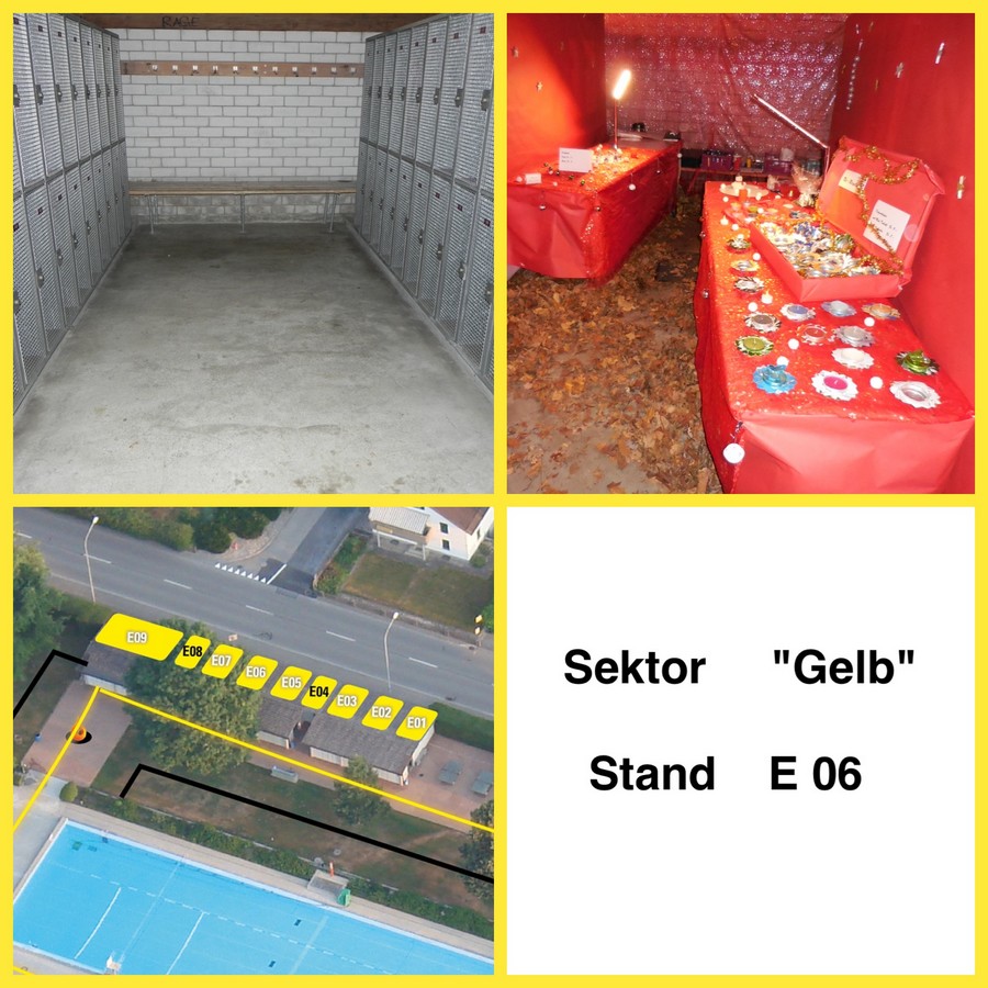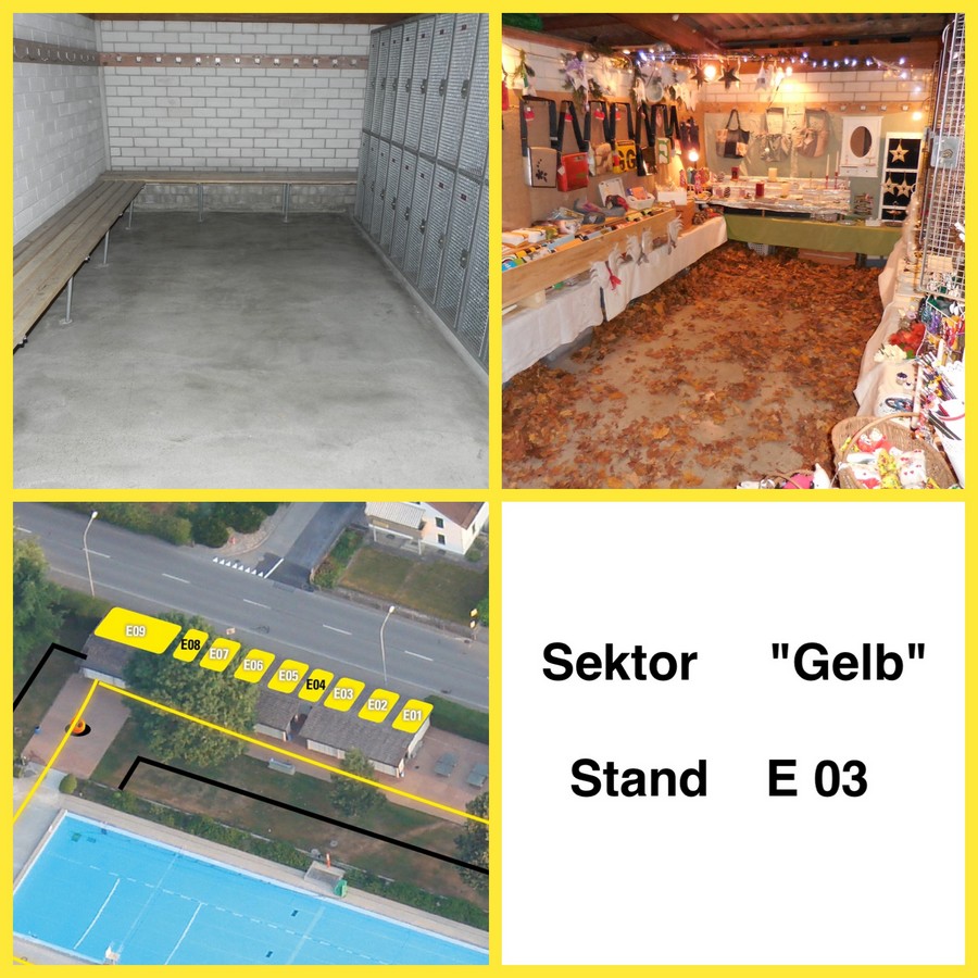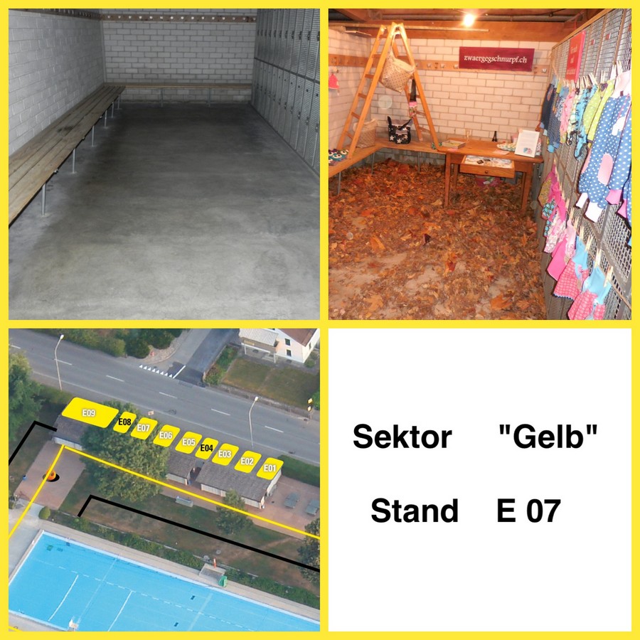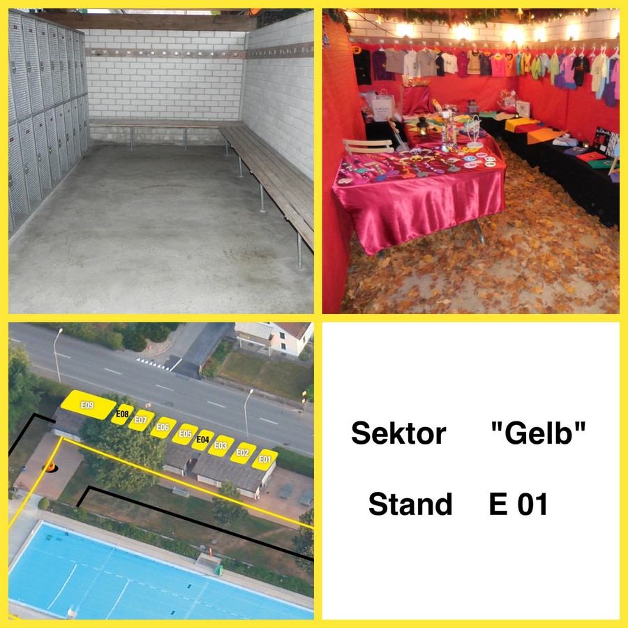 Dieser Stand befindet sich in den Garderoben und ist bedacht, ein Zelt wird deshalb nicht benötigt. Die Einkleidung und Dekoration der Wände ist Sache des Standbetreibers.